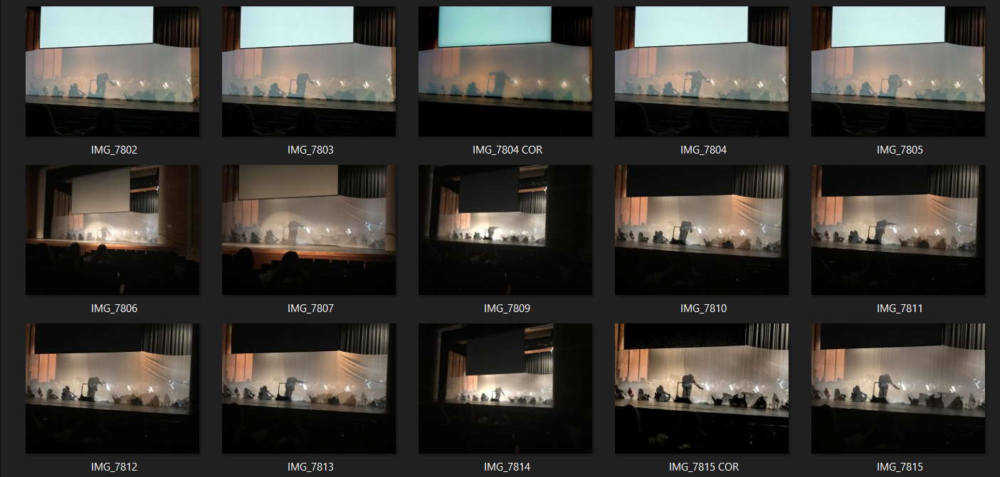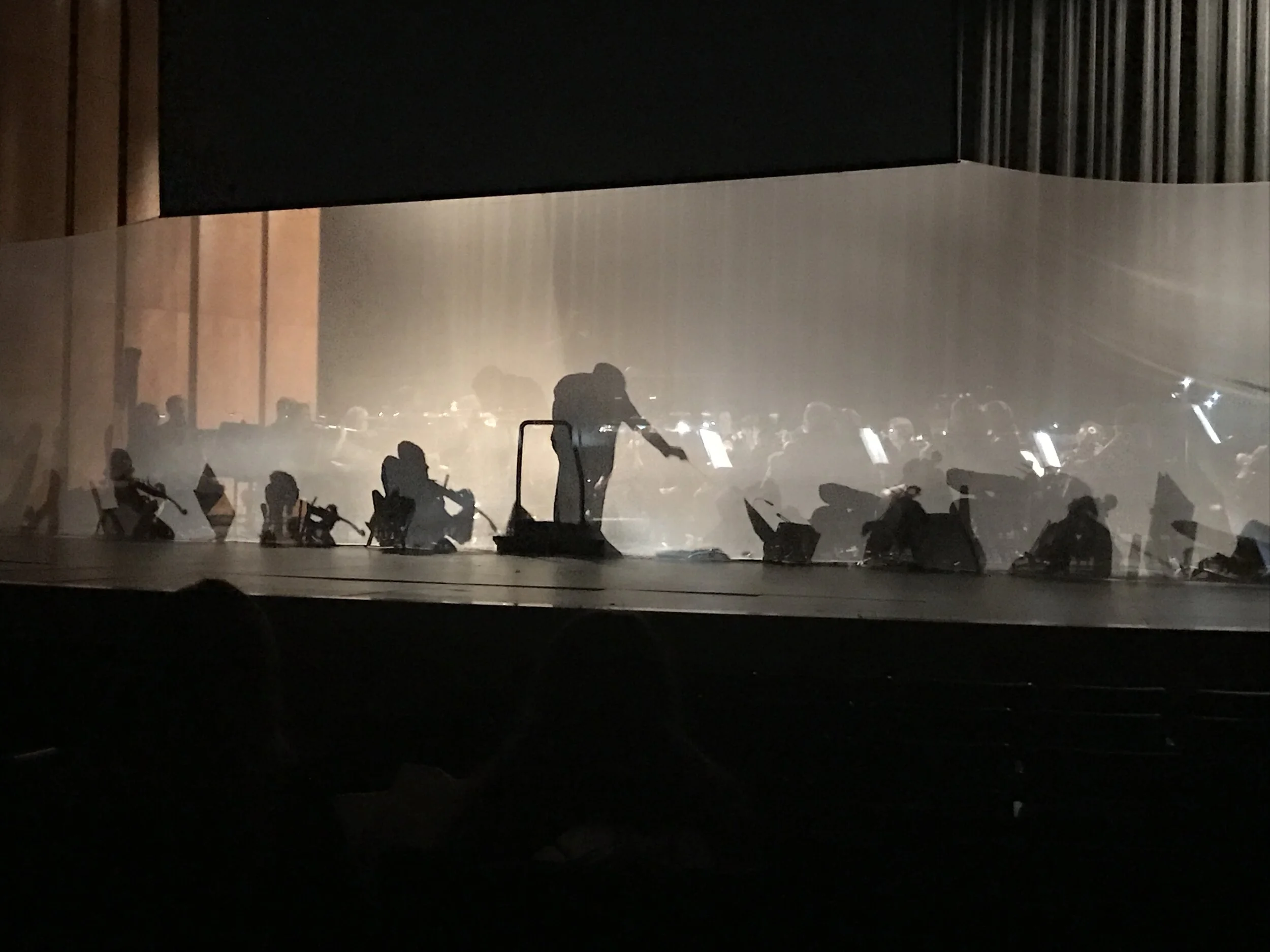a scrim is opaque and then transforms to transparent as the music transforms in parallel.